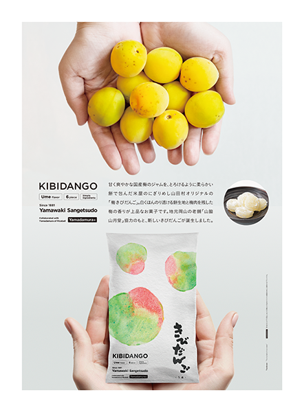 白いご飯で赤い梅を包んだ定番「梅おにぎり」をモチーフに他社が作っていない味、梅ジャムを包んだきびだんごを、きびだんご老舗メーカーである山脇山月堂との連携により商品化。きびだんごとおにぎりは、お菓子と軽食であるが、昔は、お腰に付けたきびだんご、携帯食と考えると、とても近い存在で、桃太郎の昔話でのきびだんごは実はおにぎりだっとという説も、、、