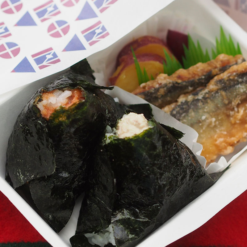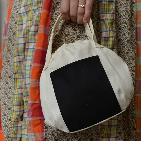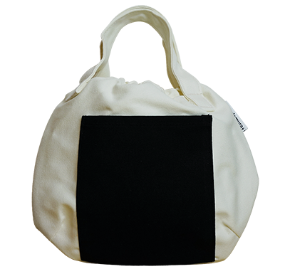 おにぎりのように、ふっくらとした丸みが可愛らしい手提げバッグ。使い勝手のよいお弁当箱サイズで、海苔の部分はポケットに。山田村店頭でご提示いただくと、おにぎりや惣菜商品を5%割引いたします。
