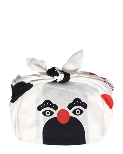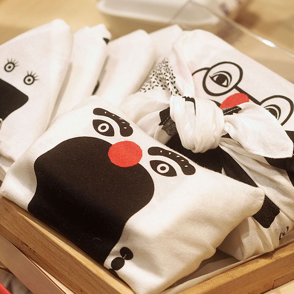 岡山のデザインユニット「cochae(コチャエ)」とのコラボレーションアイテム。通い風呂敷として山田村各店にお持ちいただくと、おにぎり、お惣菜を5%割引いたします。