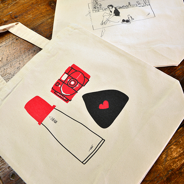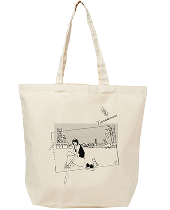 オリジナルエコバッグ。細かい面はインクジェット、裏面はシルクスクリーンのイラストに合わせた両面仕上げ。戸倉弘一朗氏による書下ろしです。