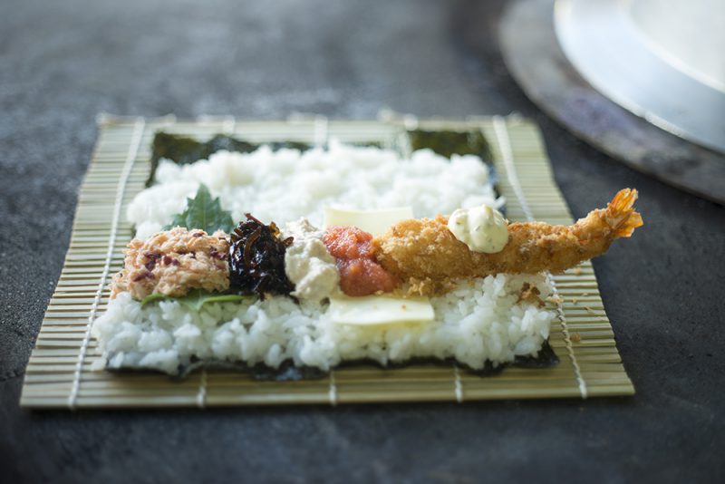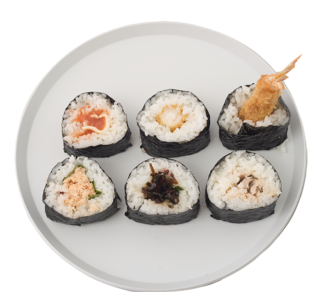 山田村人気の具材とエビフライを巻きました。梅しそ鮭、昆布、ツナマヨ、チーズ明太、エビフライの順番で、隣り合った具のマッチングも絶妙です。味の変化を楽しんでください。